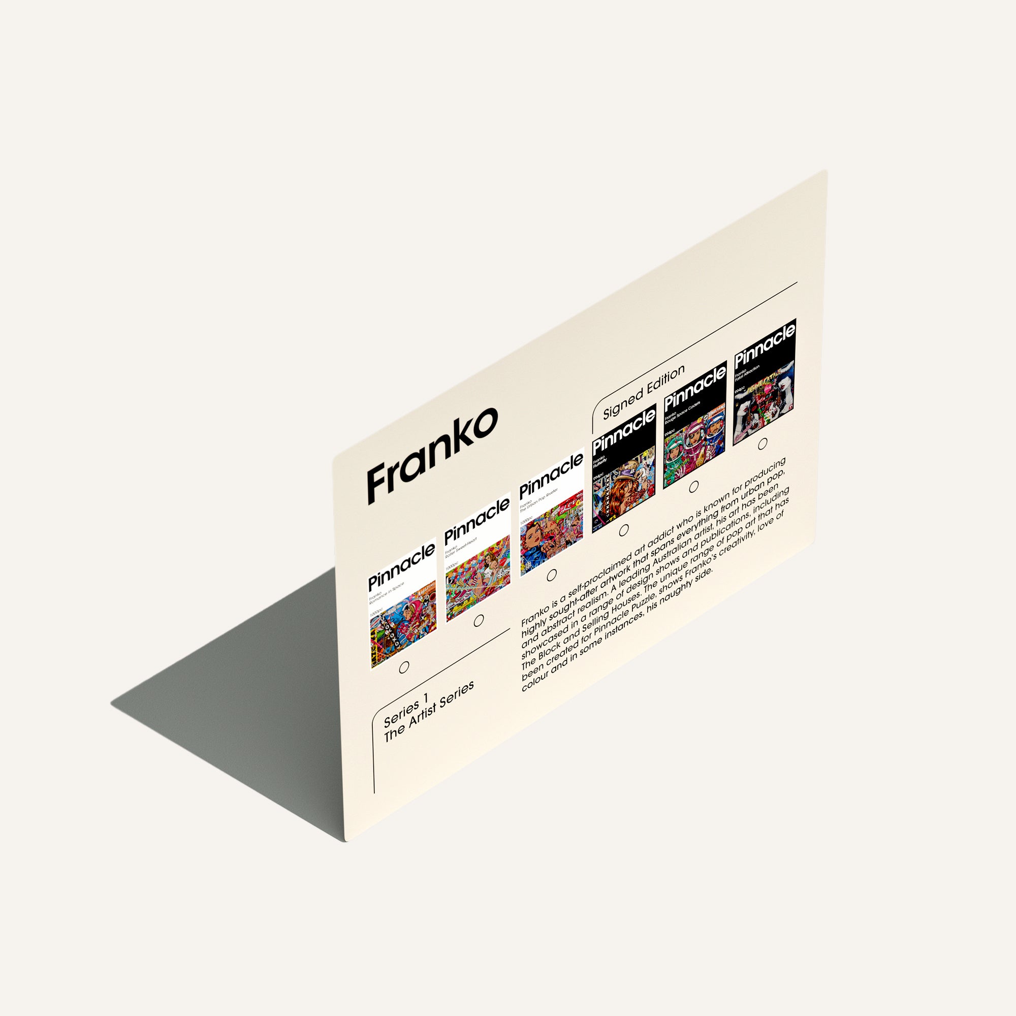Franko is a self-proclaimed art addict who is known for producing highly sought-after artwork that spans everything from urban pop to abstract realism. A leading Australian artist, his art has been showcased in a range of design shows and publications, including The Block and Selling Houses. The unique range of pop art that has been created for Pinnacle Puzzle shows Franko's creativity, love of colour and, in some instances, his naughty side.